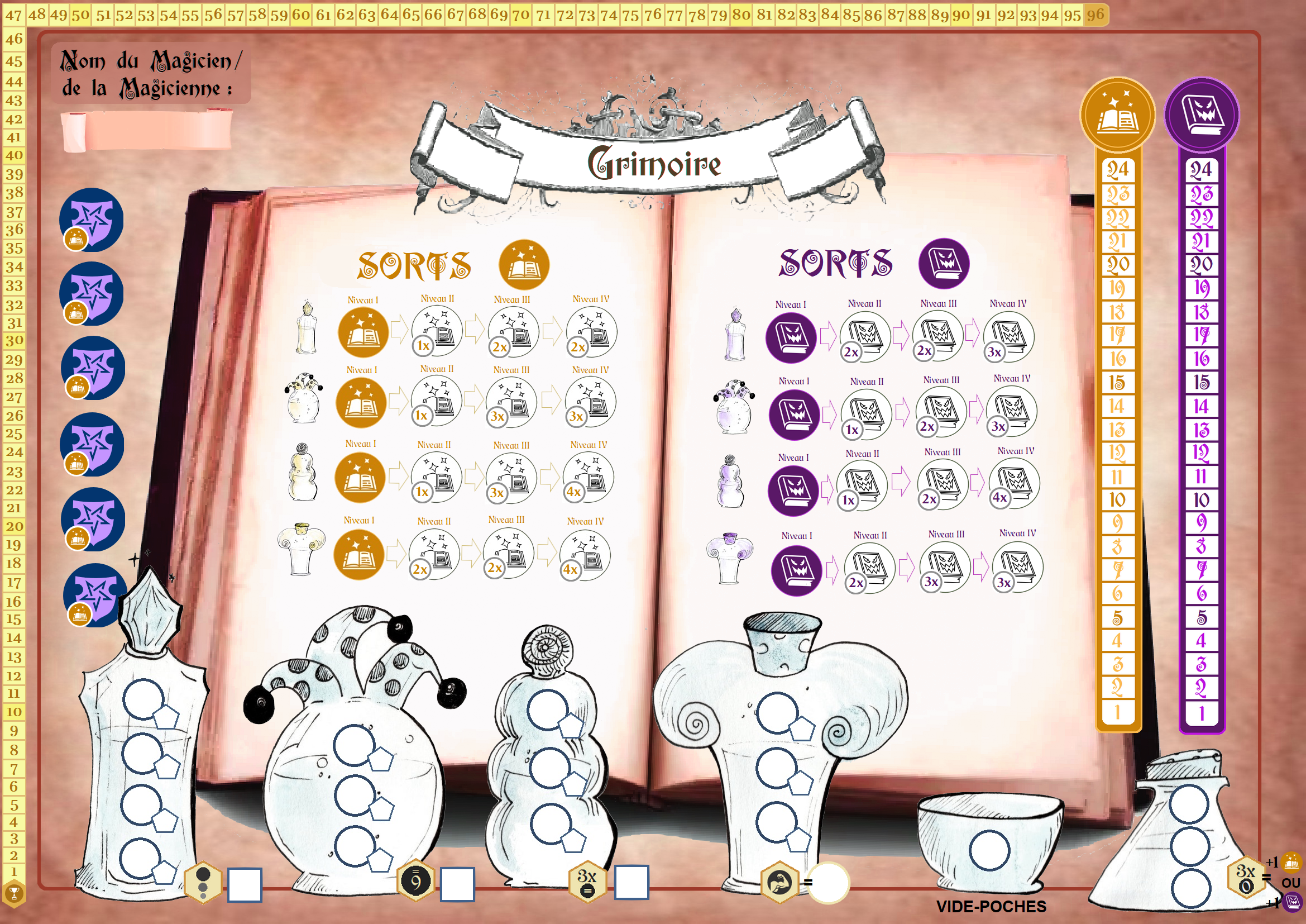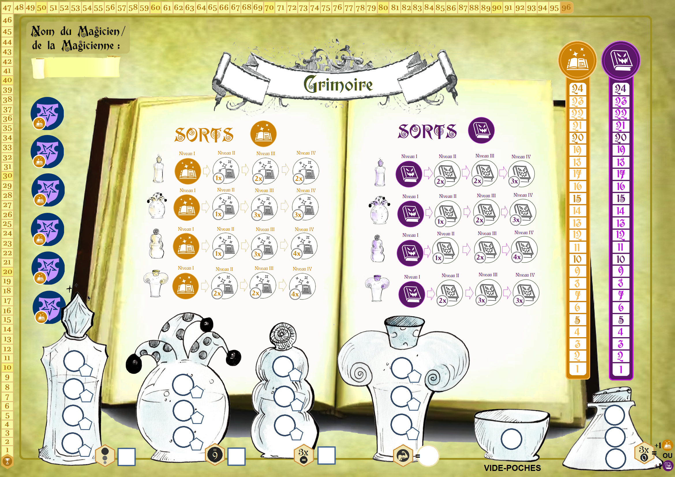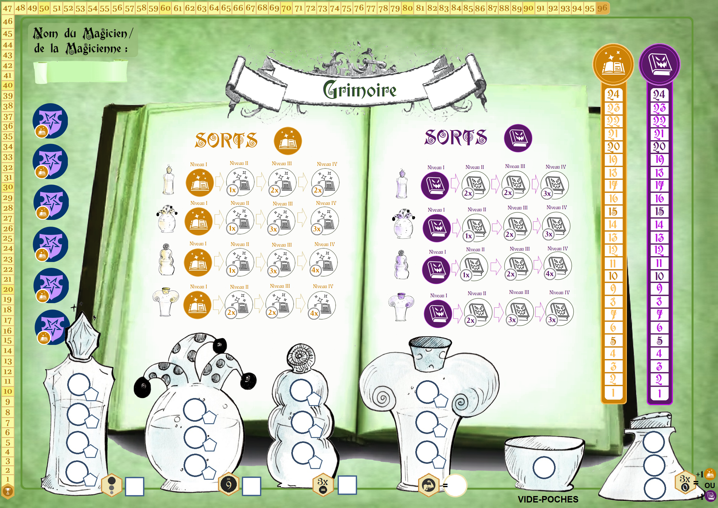 Le Laboratoire des Sortilèges est un jeu de roll and write (c’est à dire un jeu dans lequel on lance des dés avant de reporter les résultats sur une fiche Joueur.se). De ce fait, en plus du matériel, vous aurez besoin d’un crayon, d’une gomme et de plusieurs dés à 6 faces (si vous n’en avez pas assez, pas de panique : un patron à imprimer est fourni à la fin de la règle de jeu).