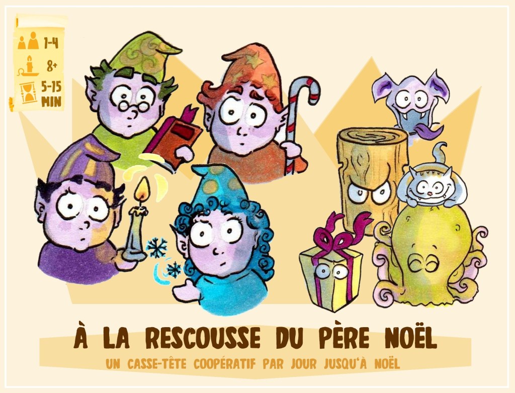 À LA RESCOUSSE DU PÈRE NOËL est un jeu pour 1 à 4 joueurs, à partir de 8 ans et pour des parties entre 5 et 15 minutes environ (selon le temps de réflexion !). C’est un jeu en téléchargement libre et gratuit. Vous trouverez le matériel nécessaire ainsi que la règle du jeu ci-dessous. Vous pouvez l’imprimer en couleur ou en noir et blanc, cela n’a pas d’incidence sur le jeu.