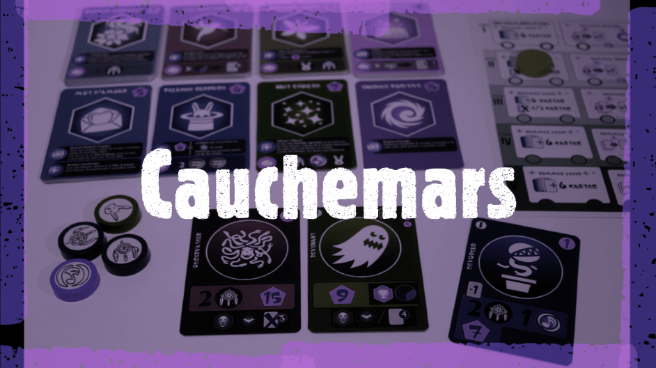 Cauchemars est un jeu qui présente un système de deckbuilding (en d’autres termes, une mécanique où l’on construit son paquet de cartes au fur et à mesure de la partie). Au fil des cycles du sommeil, les joueur.se.s devront faire évoluer leurs Armes anti-cauchemars et utiliser leurs effets au bon moment, afin d’éliminer le maximum de cauchemars et de gagner le plus de points possible. Mais attention, car les monstres invaincus deviennent plus puissants, et les apparitions sont de plus en plus difficiles à combattre tandis que la nuit avance…